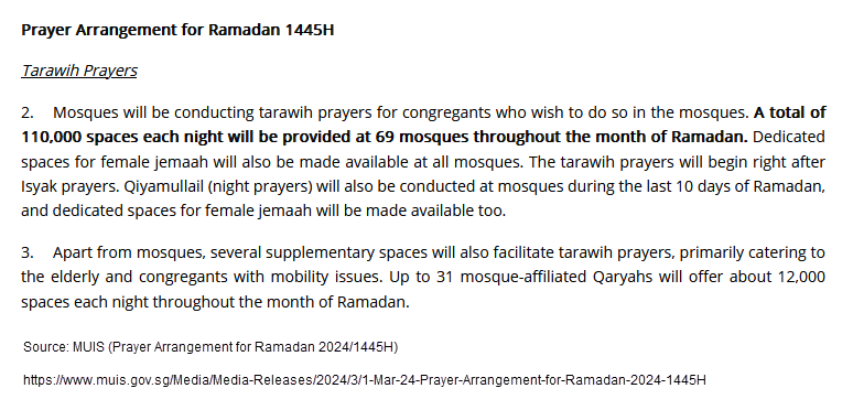 During Ramadhan 2024 there were 110,000 allocated spaces for tarawih prayers at 69 mosques and an additional 12,000 spaces at 31 mosque affiliated qaryahs each night