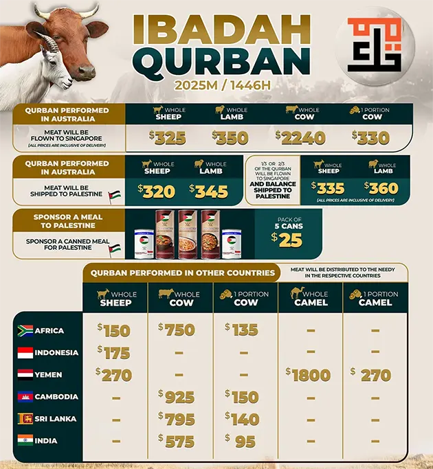 Besides being consultants to companies that import live animals into Singapore for the annual Qurban rites, they also import chilled Qurban meat for Singapore Qurban participants, as well as performing worldwide Qurban rites projects.